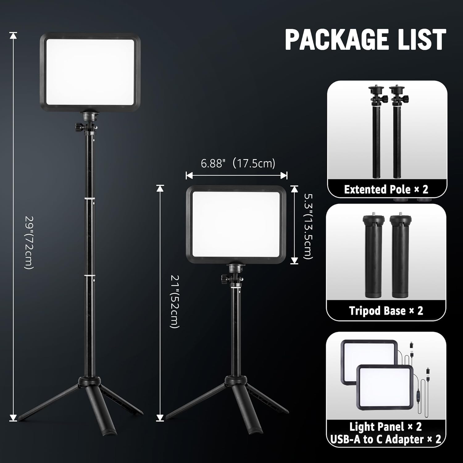 【WHAT YOU WILL GET】2 * light panel, 2 * adjusted tripod, 2 * USB-A to USB-C adapter, 1 * user manual. If there is any problem you involved in, please let us know and we will solve your problem within 24 hours.