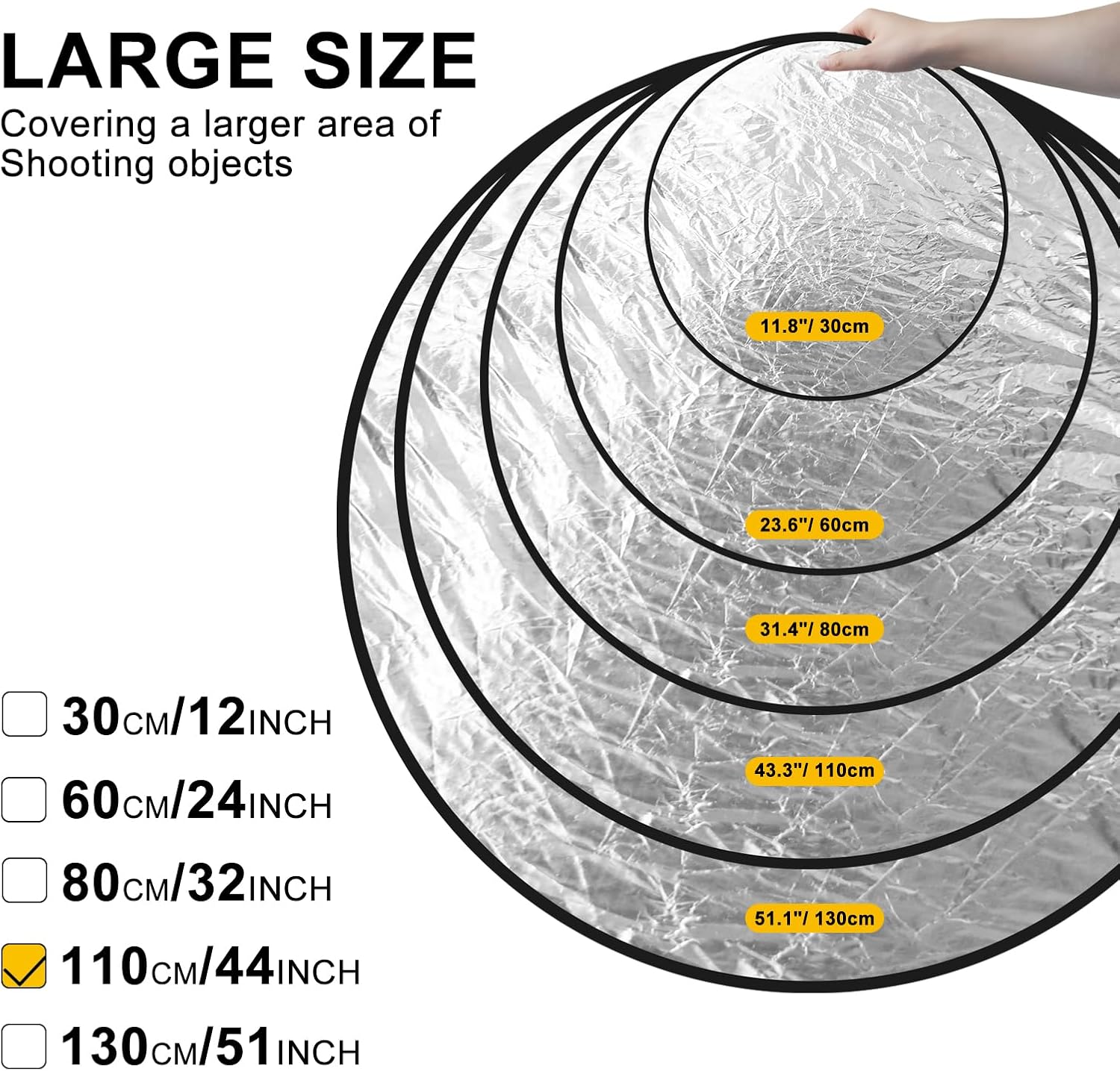 【Oversized Yet Portable】 Despite large 110cm working size, folds down to compact 17″ diameter. Weighs only 1lbs for easy transport. Included zippered case has shoulder strap. Perfect for location fashion shoots, automotive photography, and film set use. Sets up in seconds.