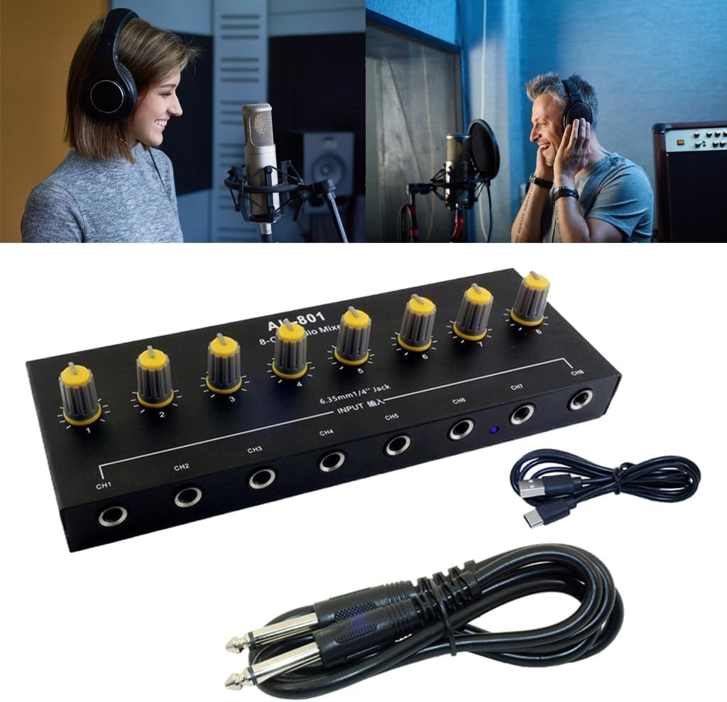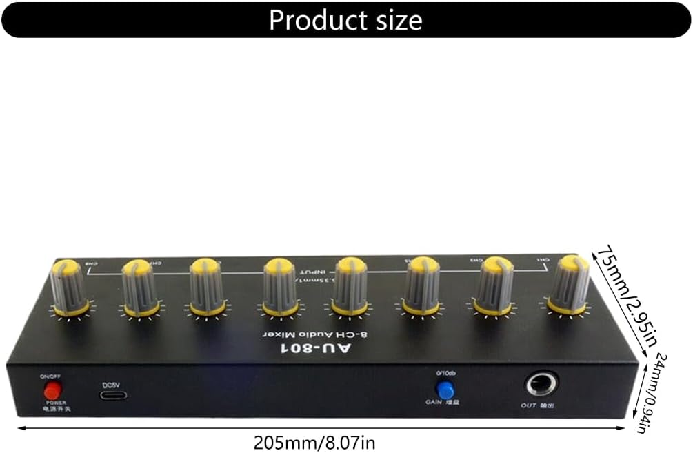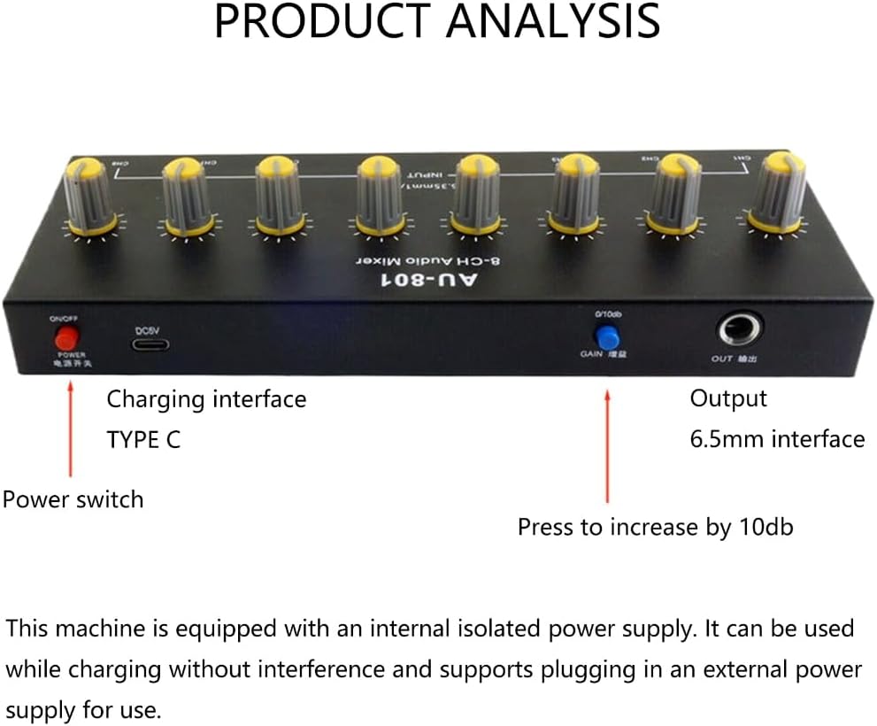 This is a small and portable mixer. If your devices have one microphones or instrument interfaces, this device can increase the number of expansion interfaces to achieve the purpose of multichannel input. It have 8-channel input and 1channel output, and the volumes of each channel can be adjusted independently.