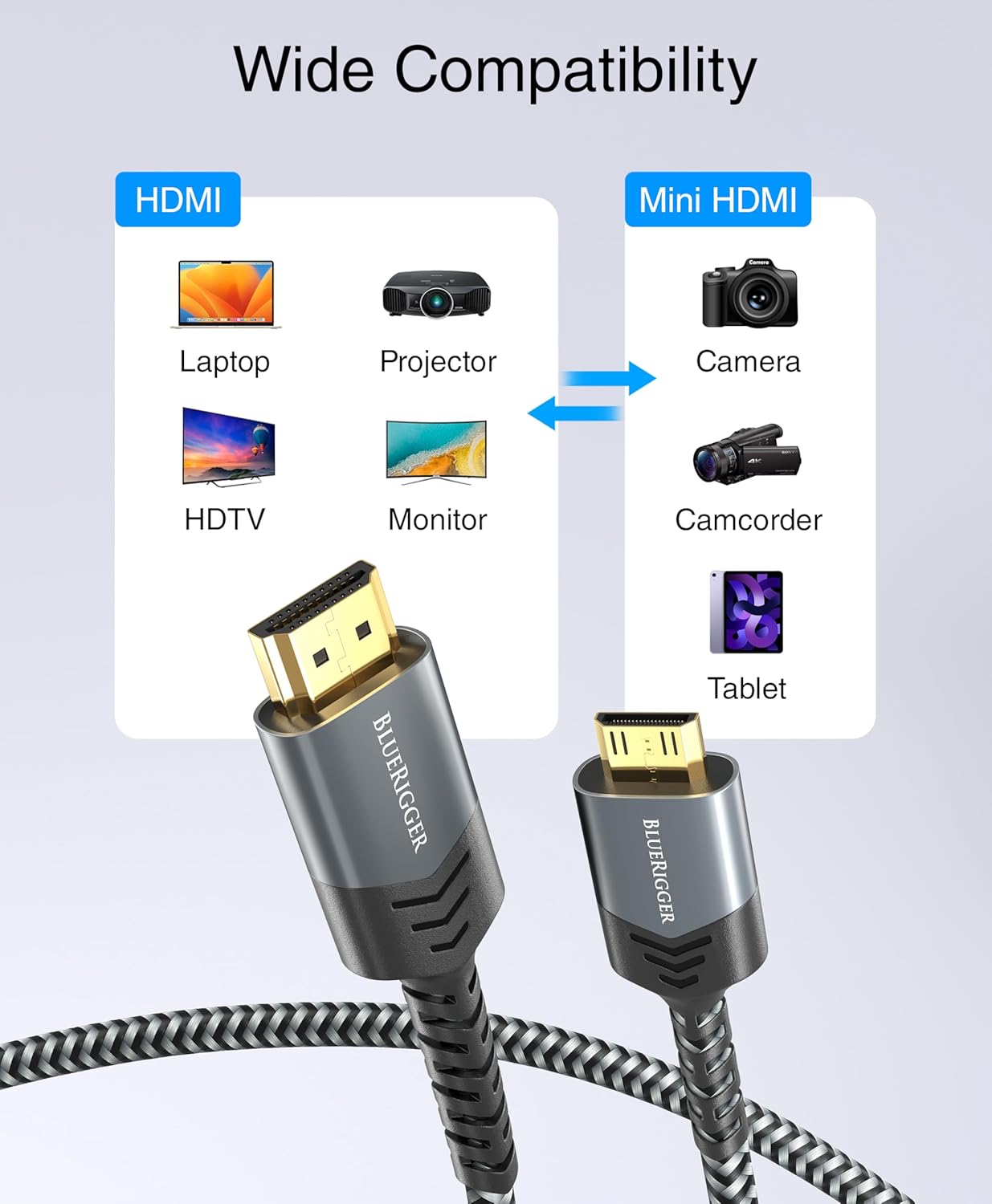 ➤ BI-DIRECTIONAL CORD: BlueRigger HDMI to mini HDMI cable is bi-directional, allowing you to connect your digital camcorders or digital cameras with mini HDMI port to a 4K TV, Monitor, Projector with an HDMI input. ➤Note: NOT COMPATIBLE with any device that only has a Micro-HDMI port or Mini USB port