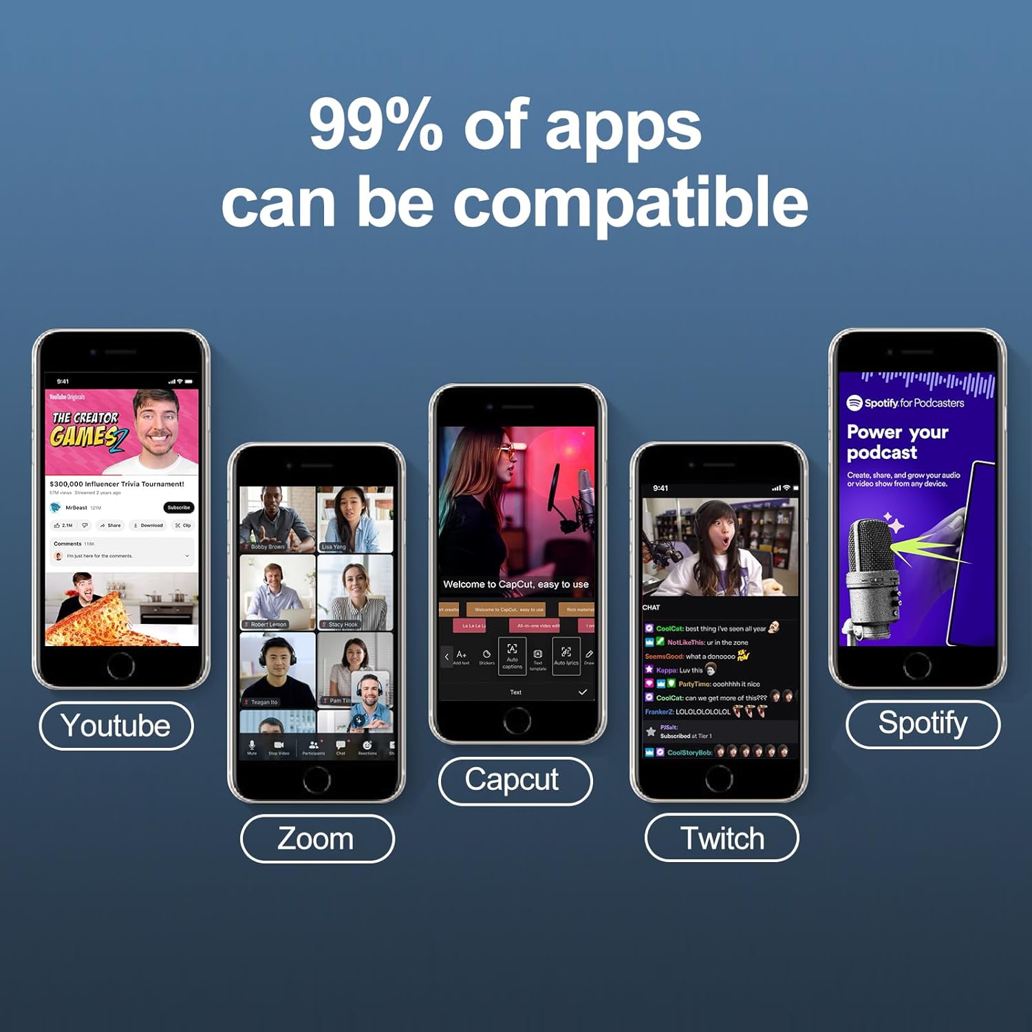 【Feature 3:Adaptable to 99% of apps and devices】 ·99% of apps can be compatible,such as Youtube、Zoom、Capcut、Twich、Spotify… ·99% of devices can be compatible,Android、IOS、Windows are fully compatible