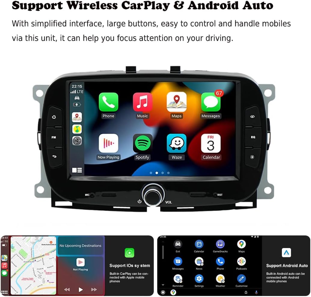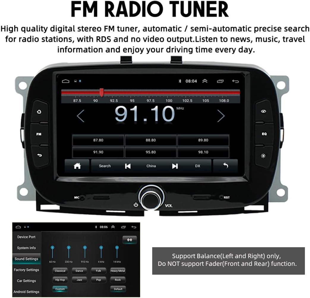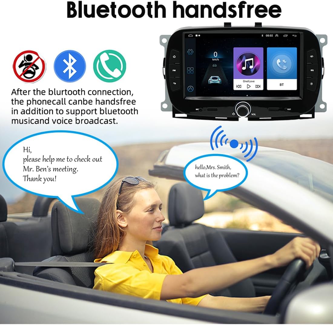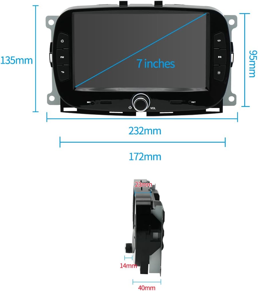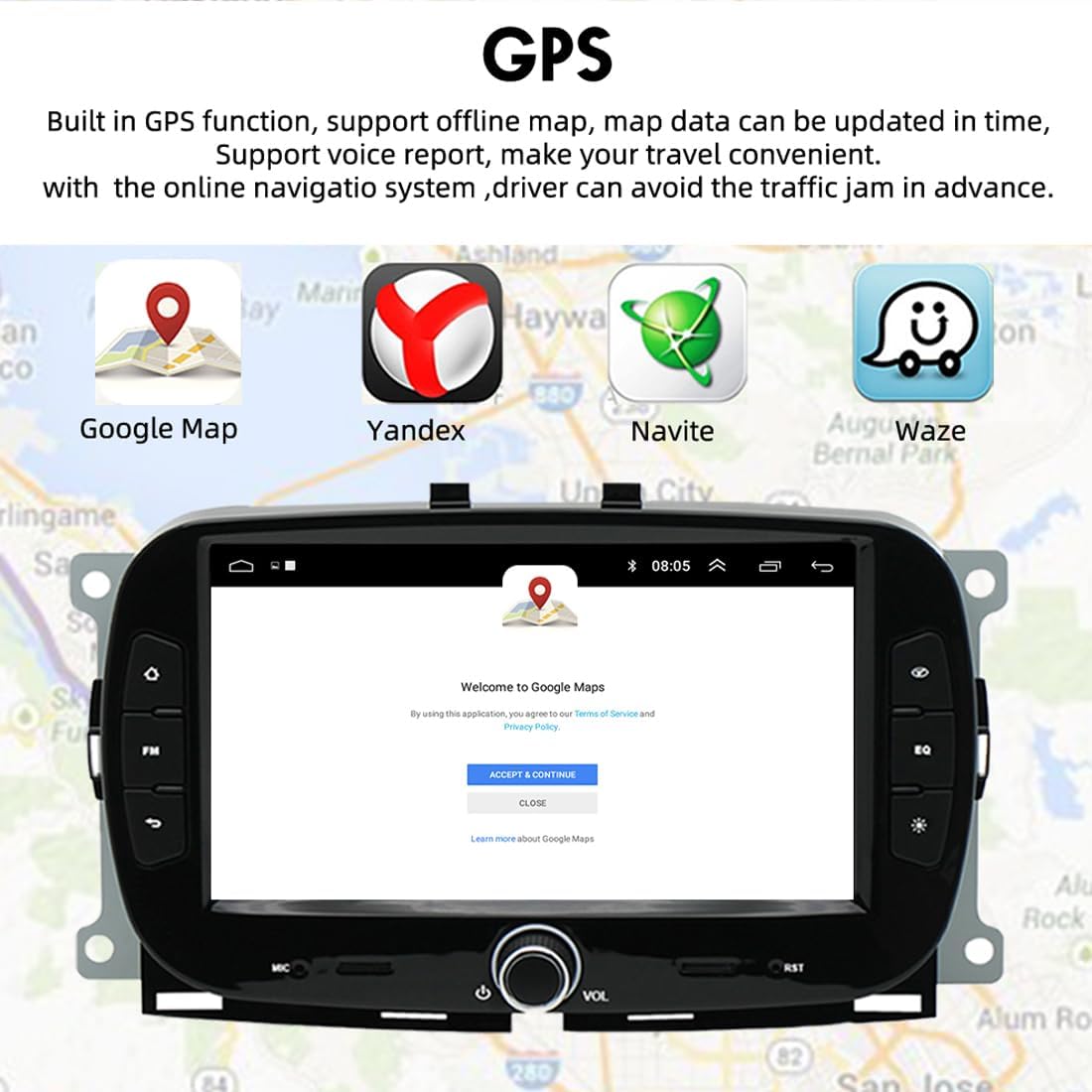 Android Car Stereo Compatible for Fiat 500 2016-2019: This Android car radio comes with a 7″ HD capacitive touchscreen. 2GB (RAM)+32GB (ROM) of memory. The car stereo comes with a split screen function, supporting the display of two pages at the same time, such as Maps and FM.
