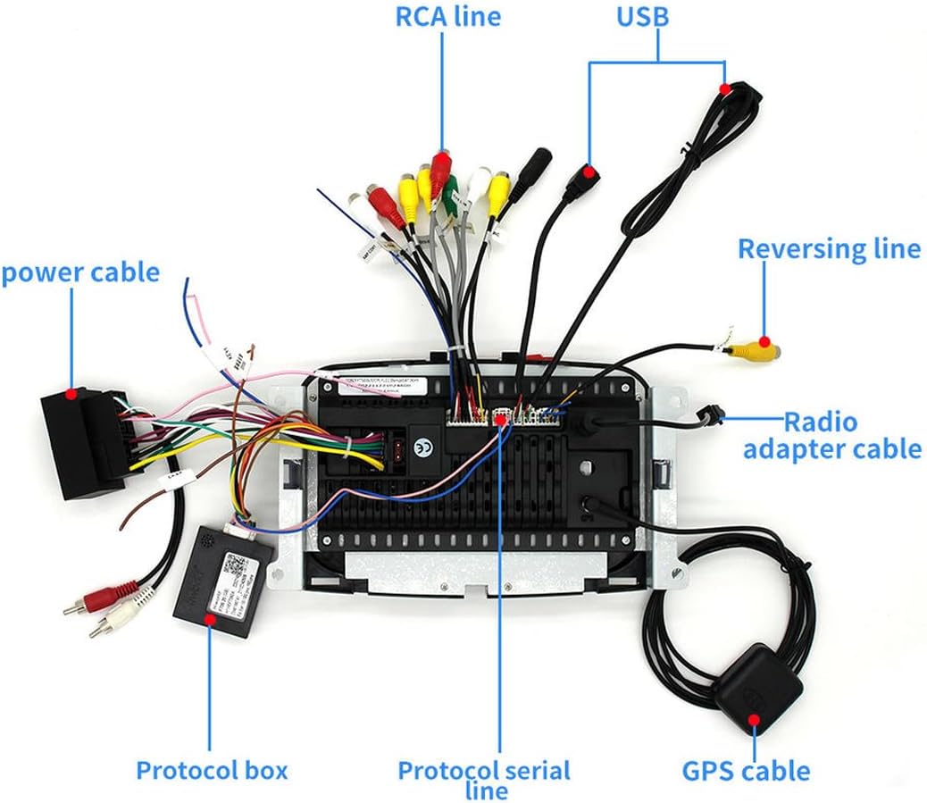 Car stereo wiring harness with labeled cables including RCA, USB, power, reversing line, radio adapter, GPS, and protocol box connections.Car stereo wiring harness with labeled cables including RCA, USB, power, reversing line, radio adapter, GPS, and protocol box connections.