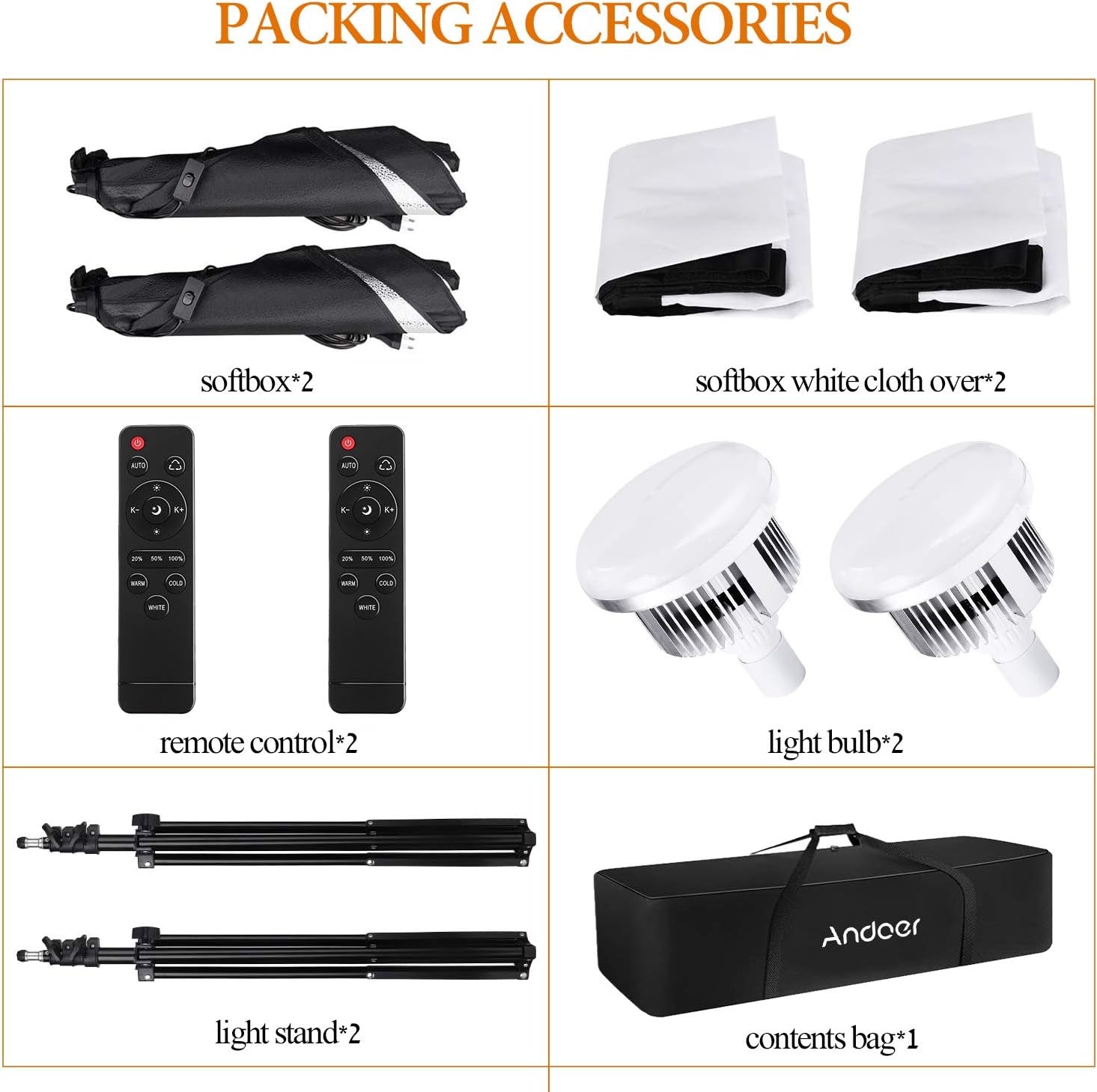 【Professional Studio Photography Light Kit】Including 2 * LED lights, 2 * softboxes, 2 * light stands, 2 * remote controls and 1 * carry, the photography light kit is perfect for home/studio video recording, live streaming, makeup, portrait and product photography, fashion photo taking, children’s photo shooting, etc.
