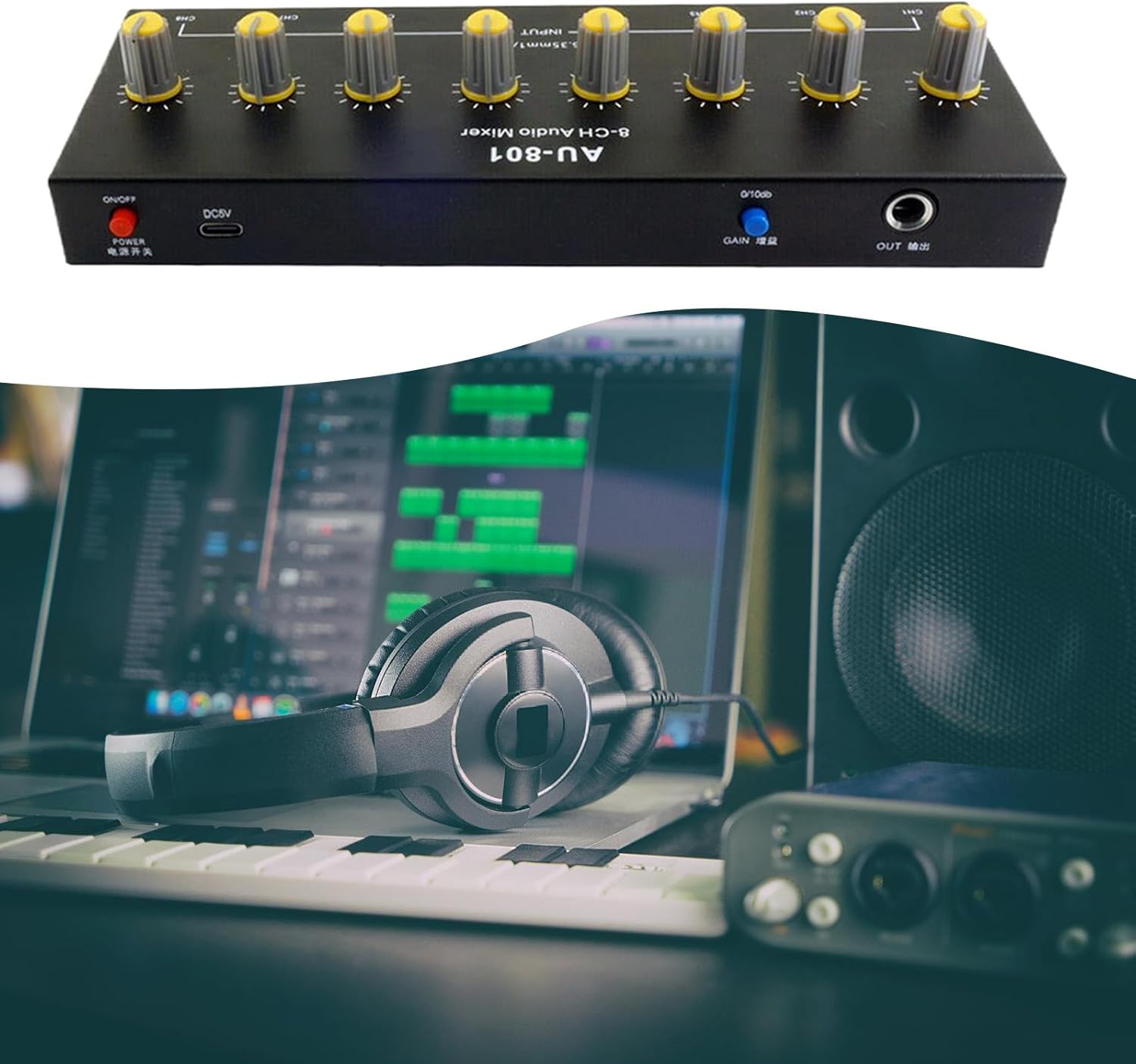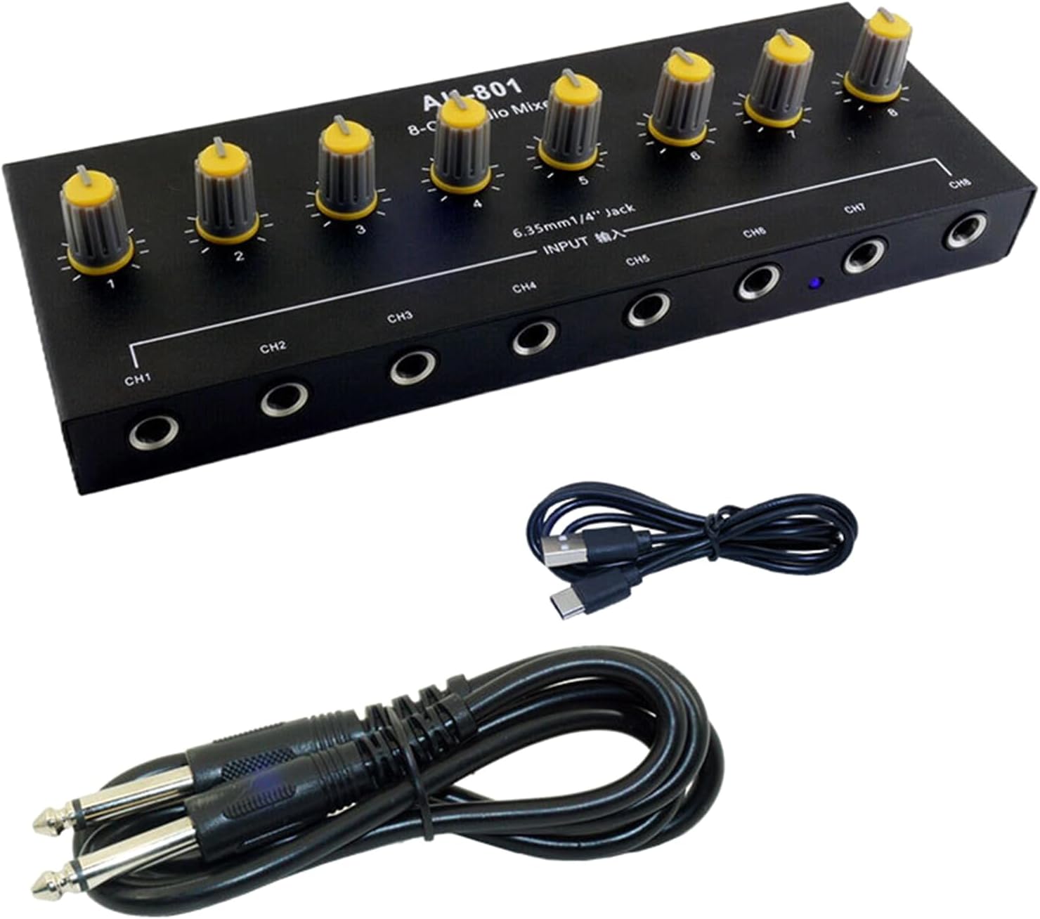 This is a small and portable mixer. If your devices have 1microphones or instrument interfaces, this device can increase the number of expansion interfaces to achieve the purpose of multichannel input. It have 8-channel input and 1channel output, and the volumes of each channel can be adjusted independently.