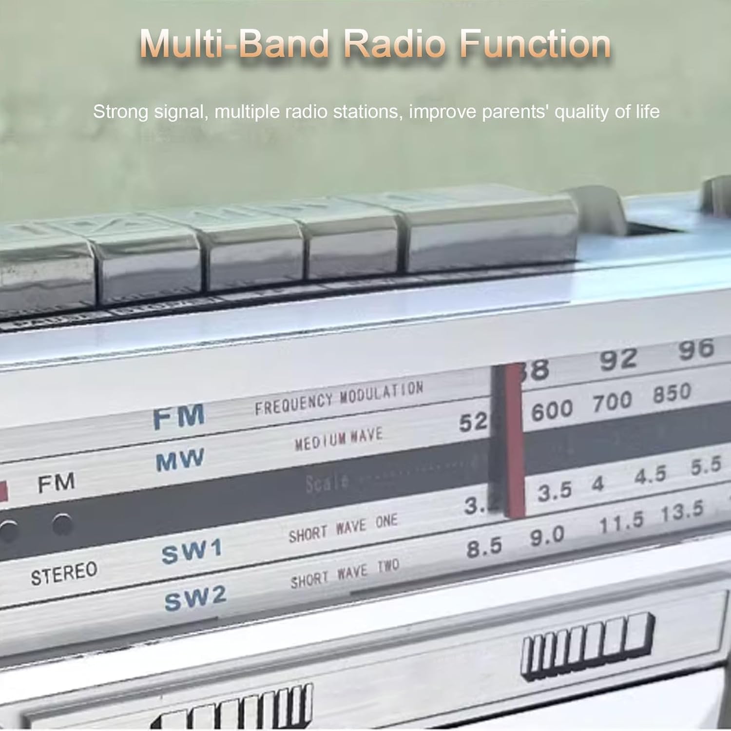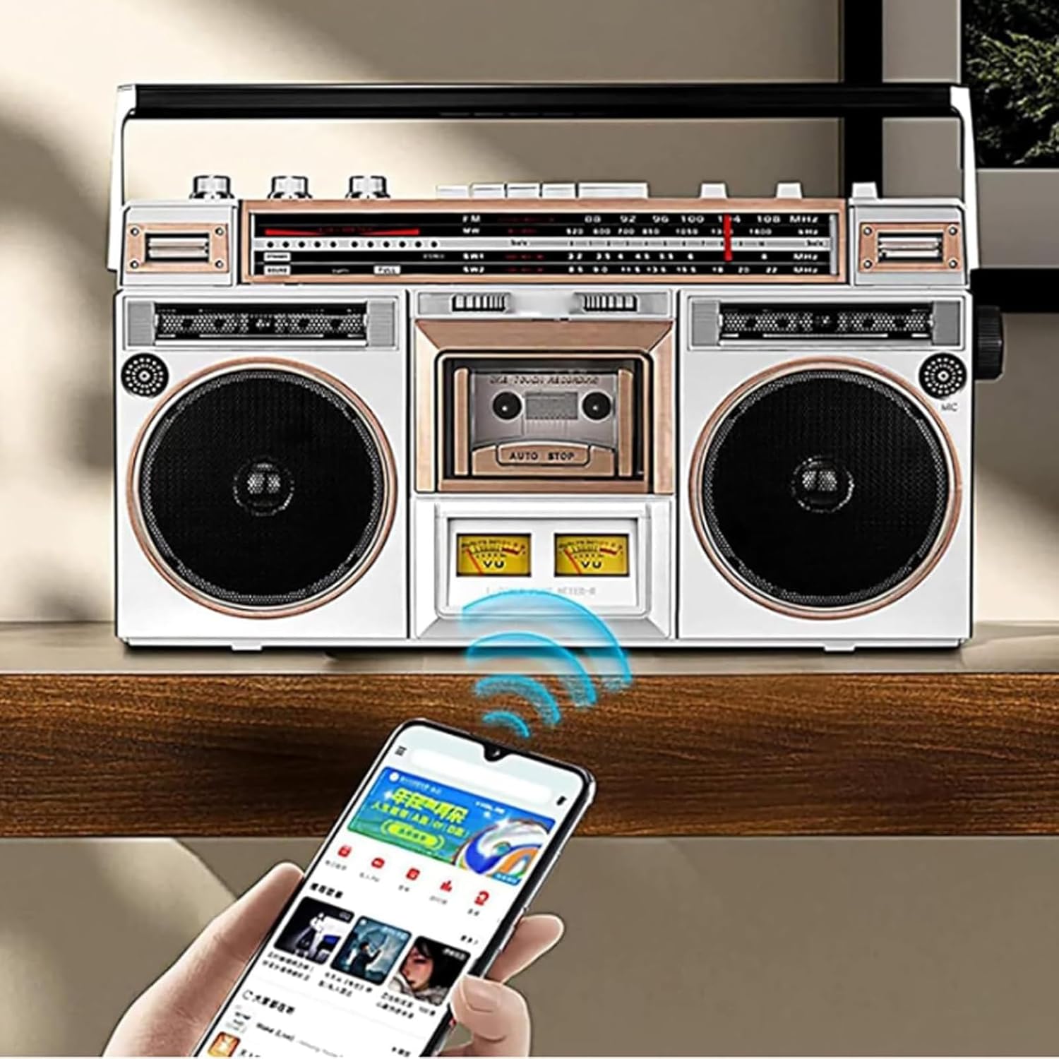 【RADIO CASSETTE】: The party shouldn’t stop because of a bad connection. The Portable Radio Box Stereo Boombox features a micro SD slot, USB port, 3.5mm aux-in, and headphone jack for never-ending music sessions from a variety of audio sources.