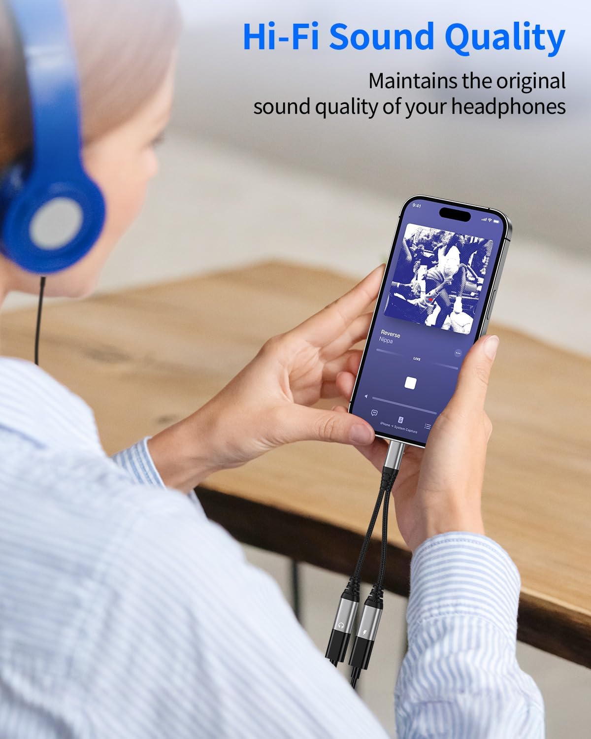 Dual USB C Headphone Jack Adapter, 2 in 1 Type C Audio + Charger Adapter Dual USB C Splitter Earphone Cable Converter Compatible with Samsung Galaxy, iPad Pro, iPhone 15 Series, More Type C Devices