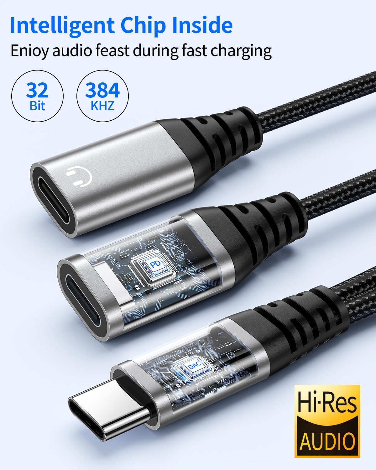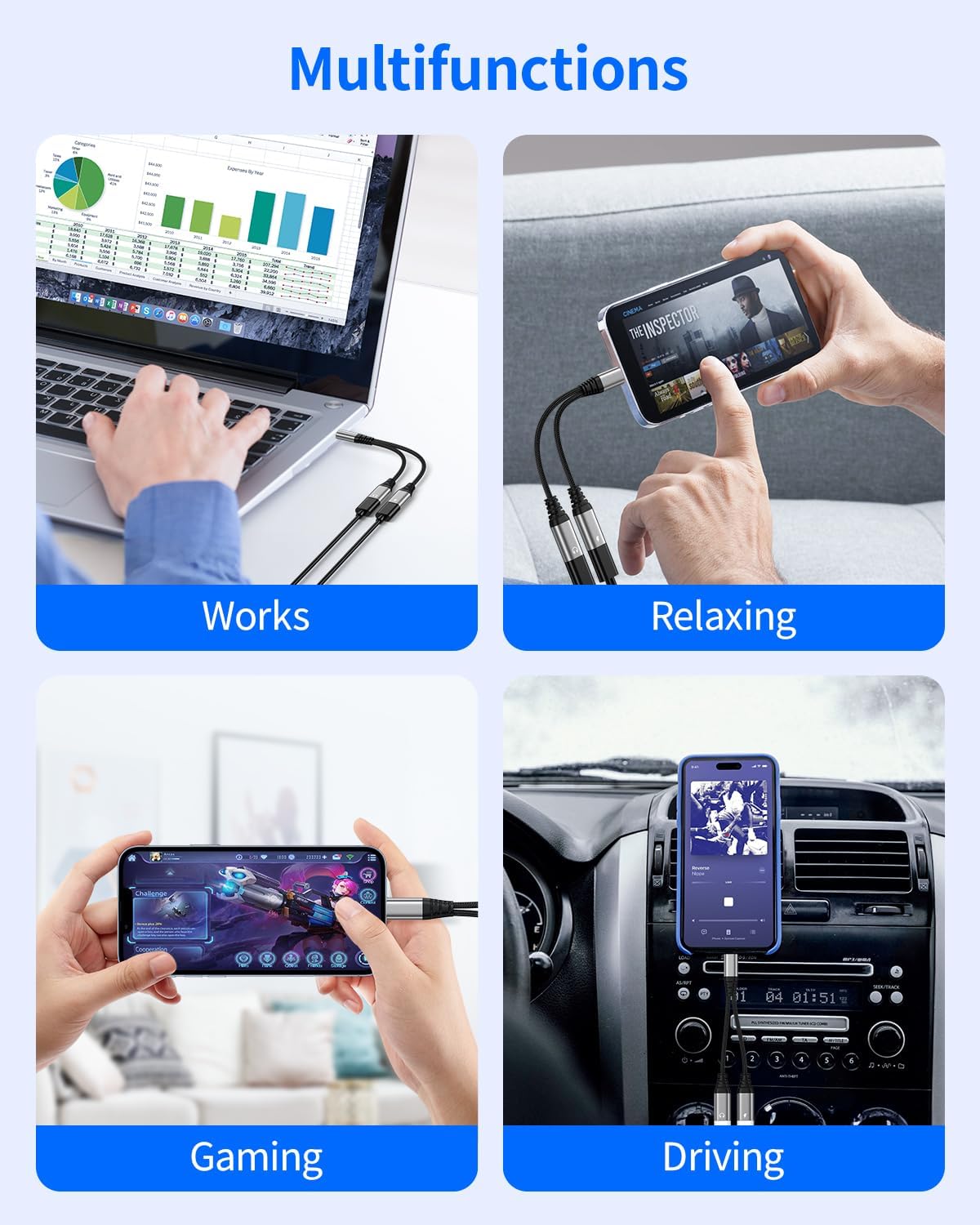 【Multi-function adapter】: This USB C to USB C audio charger adapter allows you to listen to music, play games, make calls or watch videos while charging, and also supports line control function. Plug and play, no driver required. Note: Data transmission is not supported.