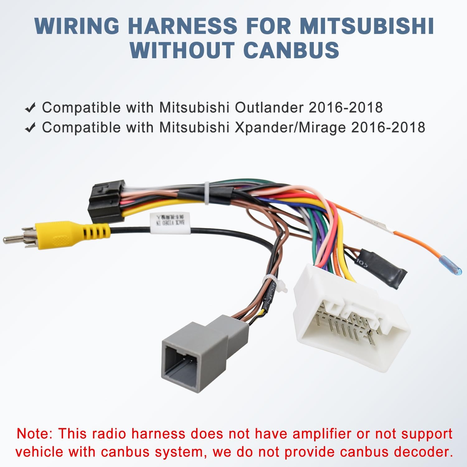 Radio Harness Replacement for Mitsubishi: 20pin car stereo wire harness connector fits for Mitsubishi Outlander 2016-2018, Mitsubishi Xpander Mirage 2016-2018. Please check your vehicle connector is 20Pin or not. Notice: Our harness DOES NOT support CANBUS and Factory Camera