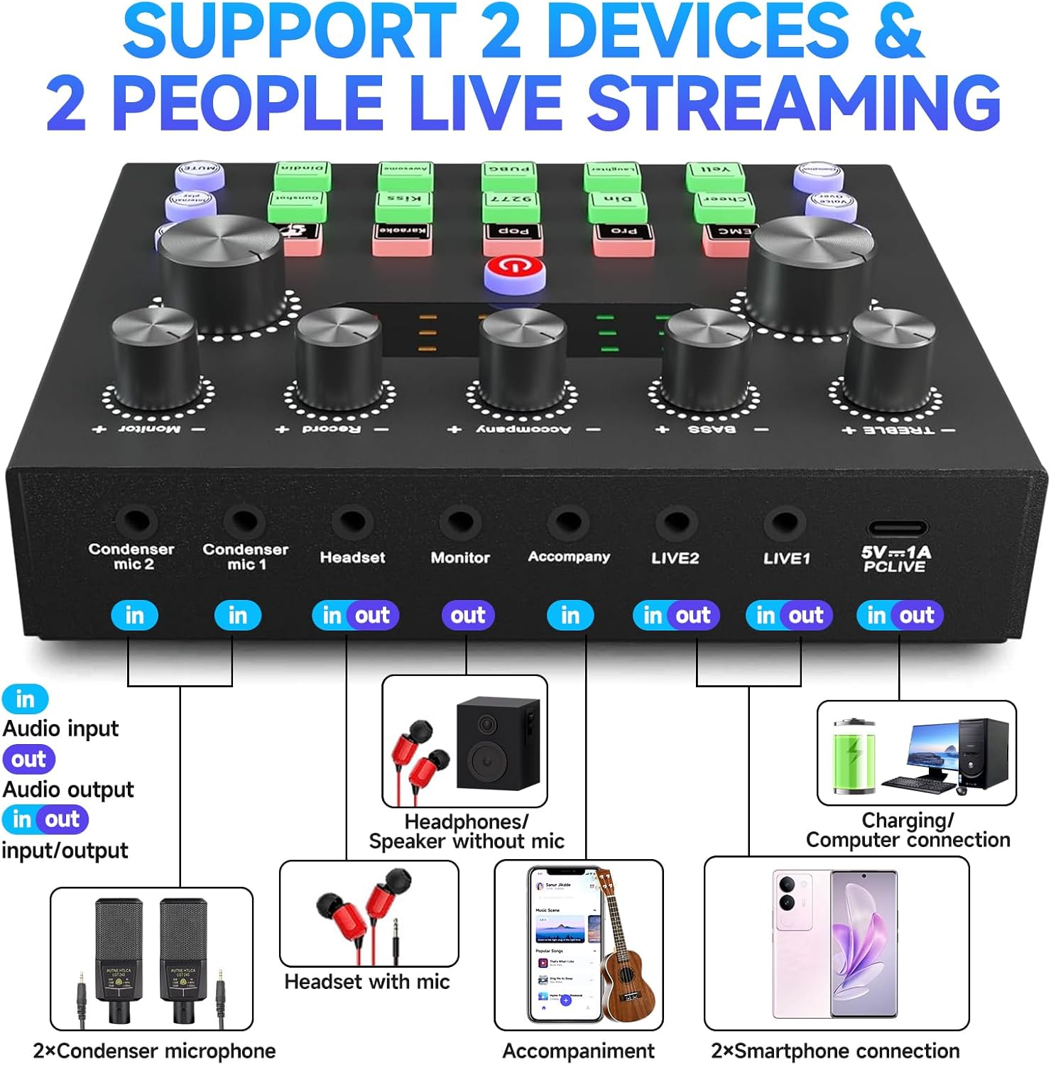 【MULTIPLE EFFECTS & VARIABLE MICROPHONE MODES】: Multi-functional sound card live streaming mixer with 6 mode choices, 12 electronic effect options, 12 fun sound effects, 7 different game modes, and 4 variable voice modes. The Podcasting Device Bundle provides excitement, baby, male, female, and magic voice changing microphones for 2 people.