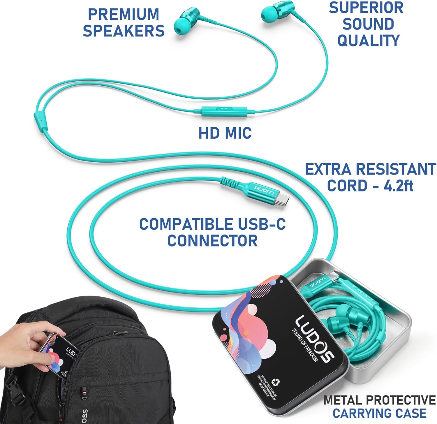 Ludos OMNITONE USB C Headphones, 5 Years Warranty, USB-C Earbuds for iPhone 16 15 Pro Max Plus Samsung Galaxy S24 S23 Ultra S22 S21 FE S20 Z Flip 3 Fold 4 A53 A54, USB Type C Earphones – Turquoise