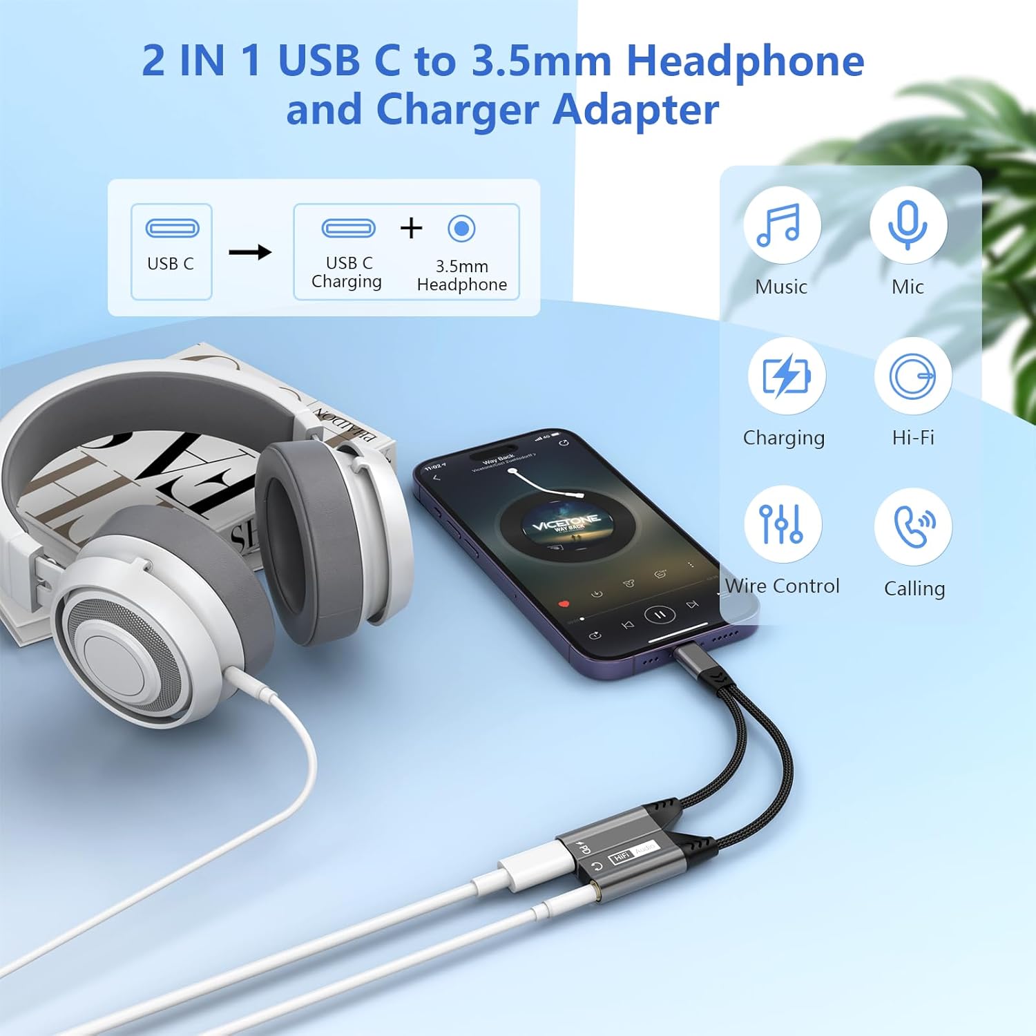 【2-IN-1 USB C Headphone Adapter】USB C to 3.5mm jack headphone and charger cable adapter, one cable can support video call/music/charging/Hi-Fi/microphone/control 6 functions. With the iPhone 16 headphone jack adapter, you can listen to music and charge your phone at the same time. This convenient USB C to 3.5mm jack audio adapter supports music playback and calls on most USB C devices.