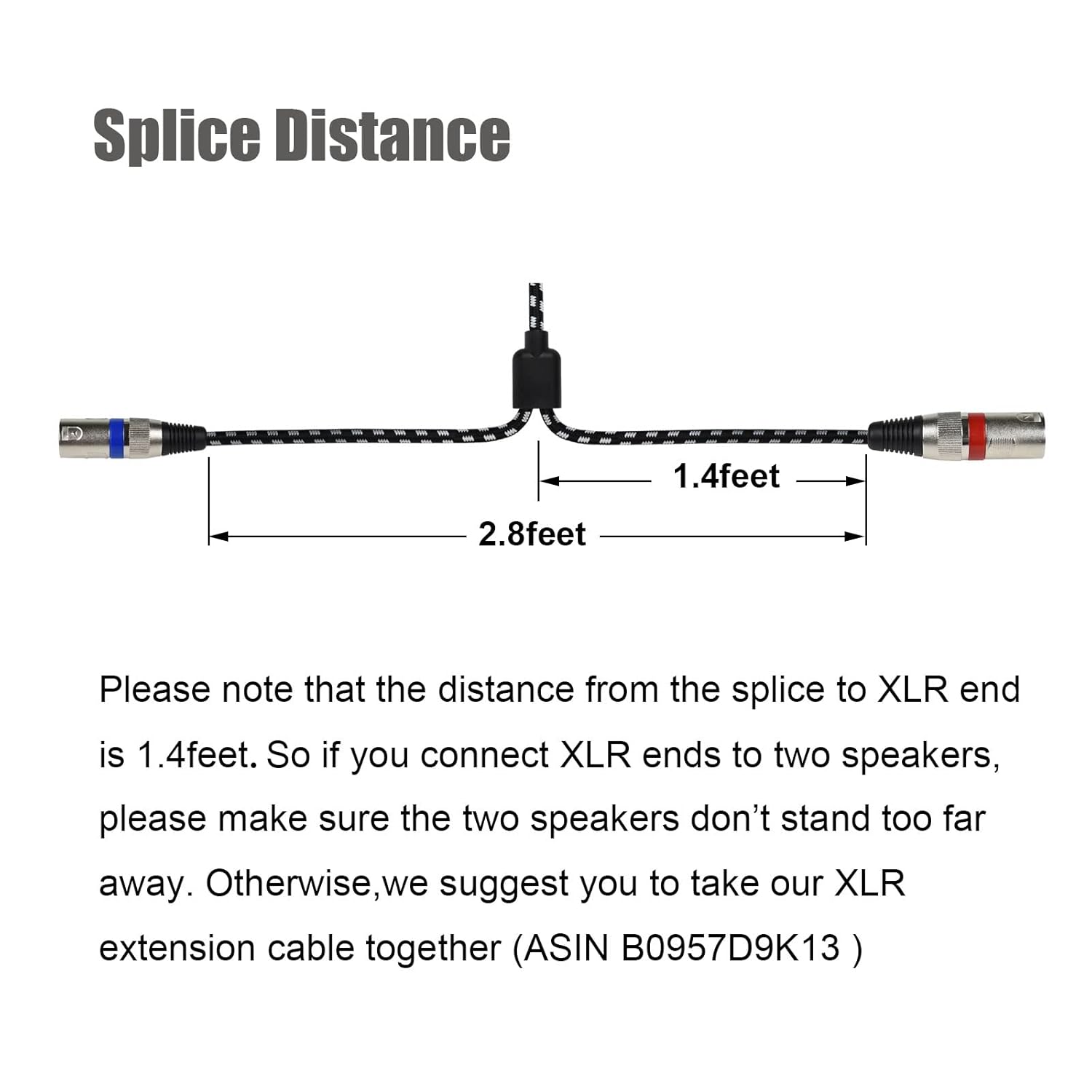 Splice ditance: VERY VERY import, please kindly note that the splice to the XLR end is only 3.3 feet. So if you connect the 2 XLR connector to two separate speakers, you should make sure the two speaker don’t stand too far away