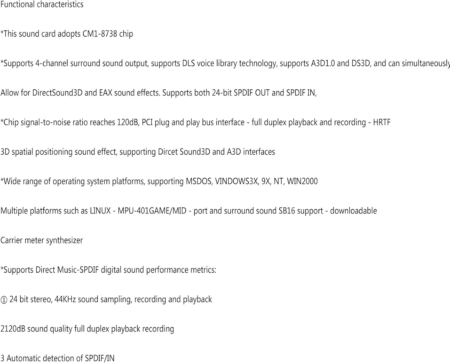 Wide rangeof operating platforms, supporting multiple platforms such as MSDOS, WINDOWS3X, 9X, WIN2000, LINUXetc. MPU401 GAME port and surround sound SB16 downloadable waveform synthesizer