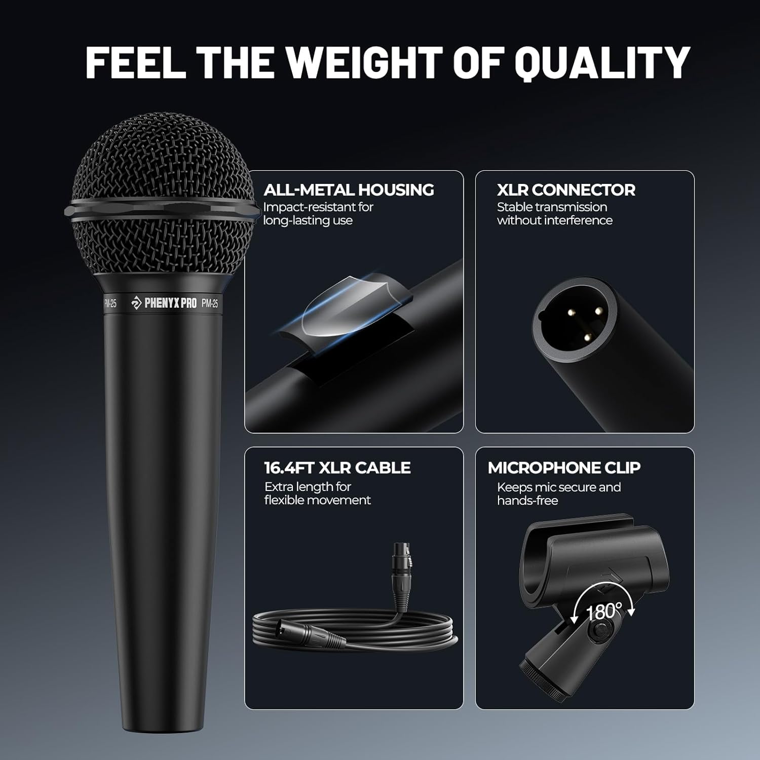 Phenyx Pro Dynamic Vocal Microphone, Cardioid Microphone with 16.4 ft XLR Cable, Mic Clip, Storage Bag, Wired Handheld Mic for Singing, Stage, Studio, Karaoke (PM-25)