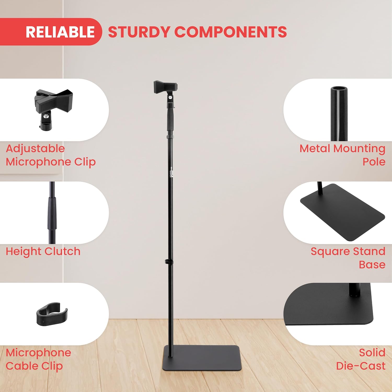Pyle Square Base Microphone Stand with Mic Clip – Heavy Duty, Height Adjustable, 36.2″ to 63.38”, Solid Die-Cast Base, Studio & Concert Use, Universal 5/8” Adapter, Cable Clip Included