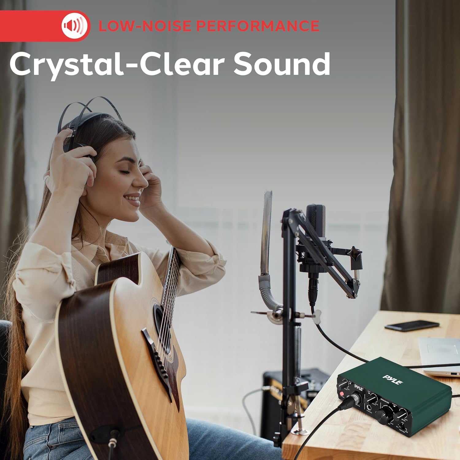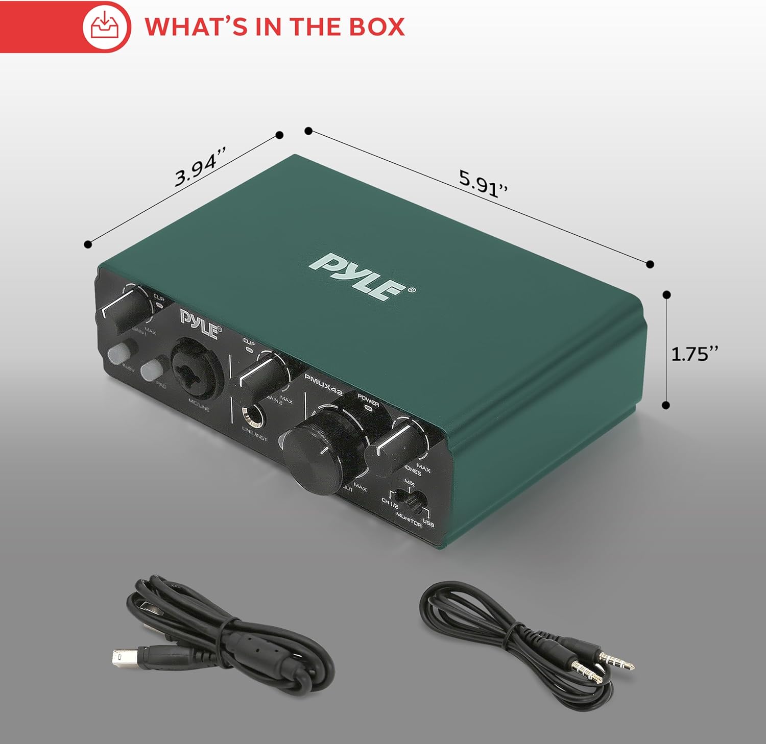 Pyle USB Audio Interface for Recording Music, Podcasting, and Streaming – 2-IN/2-OUT, 24bit/192kHz, Low-Noise, High-Fidelity Studio Quality, USB Powered, Rugged Metal Chassis, 5.9″ x 4″ x 1.8″