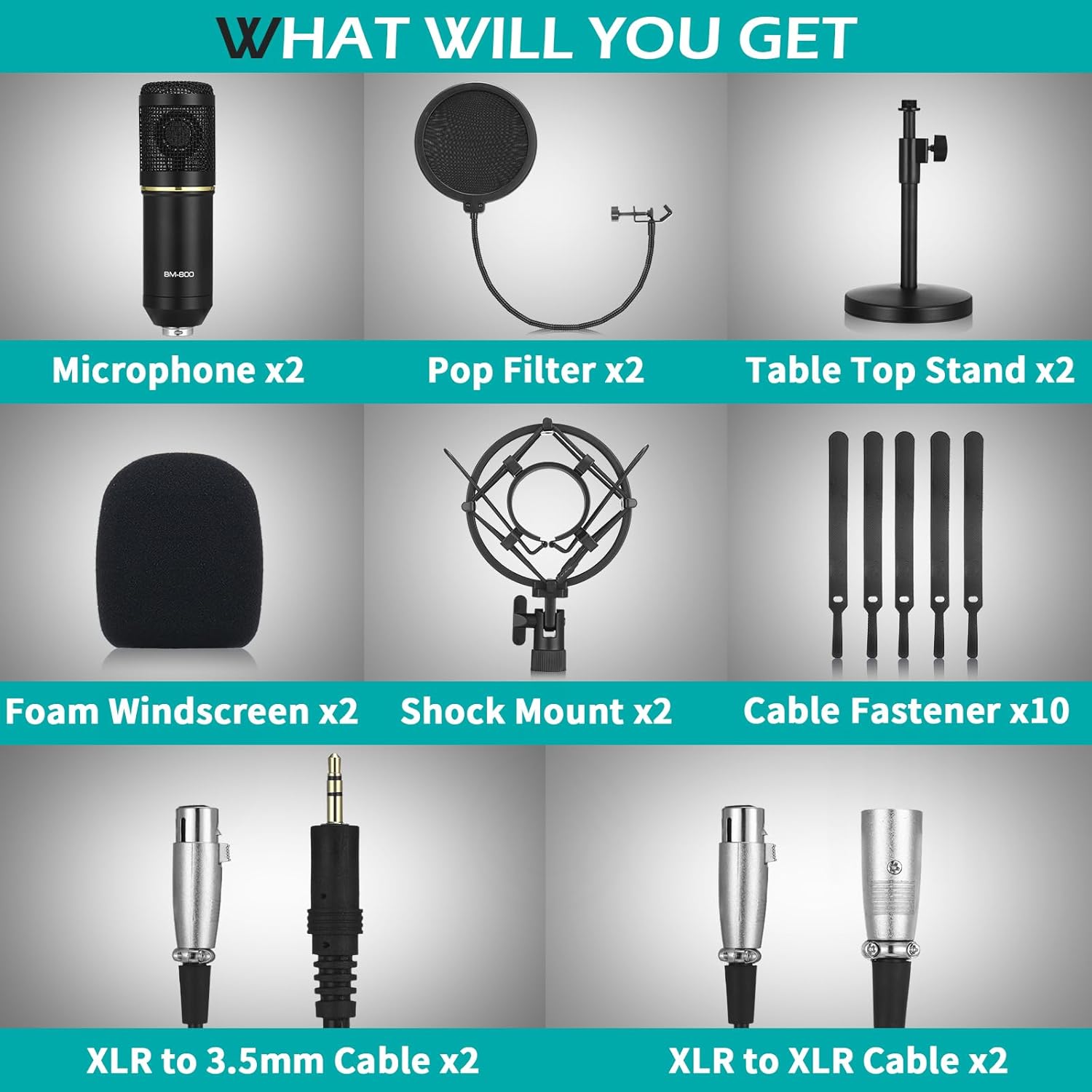 Accessory Package Includes: the package includes 2 packs of condenser recording equipments, 2 pieces of studio grade shock mounts, 2 pieces of shock stands, 2 pieces of windproof cottons, 2 pieces of blowout nets, 2 pieces of 3.5 mm microphone cables, 2 pieces of metal rods, 2 pieces of disc bases, 2 pieces of male female cables, 10 pieces of hook and loop fastener strips, a user manual, which is complete set of parts, a practical package to meet your daily needs and also to share with your team