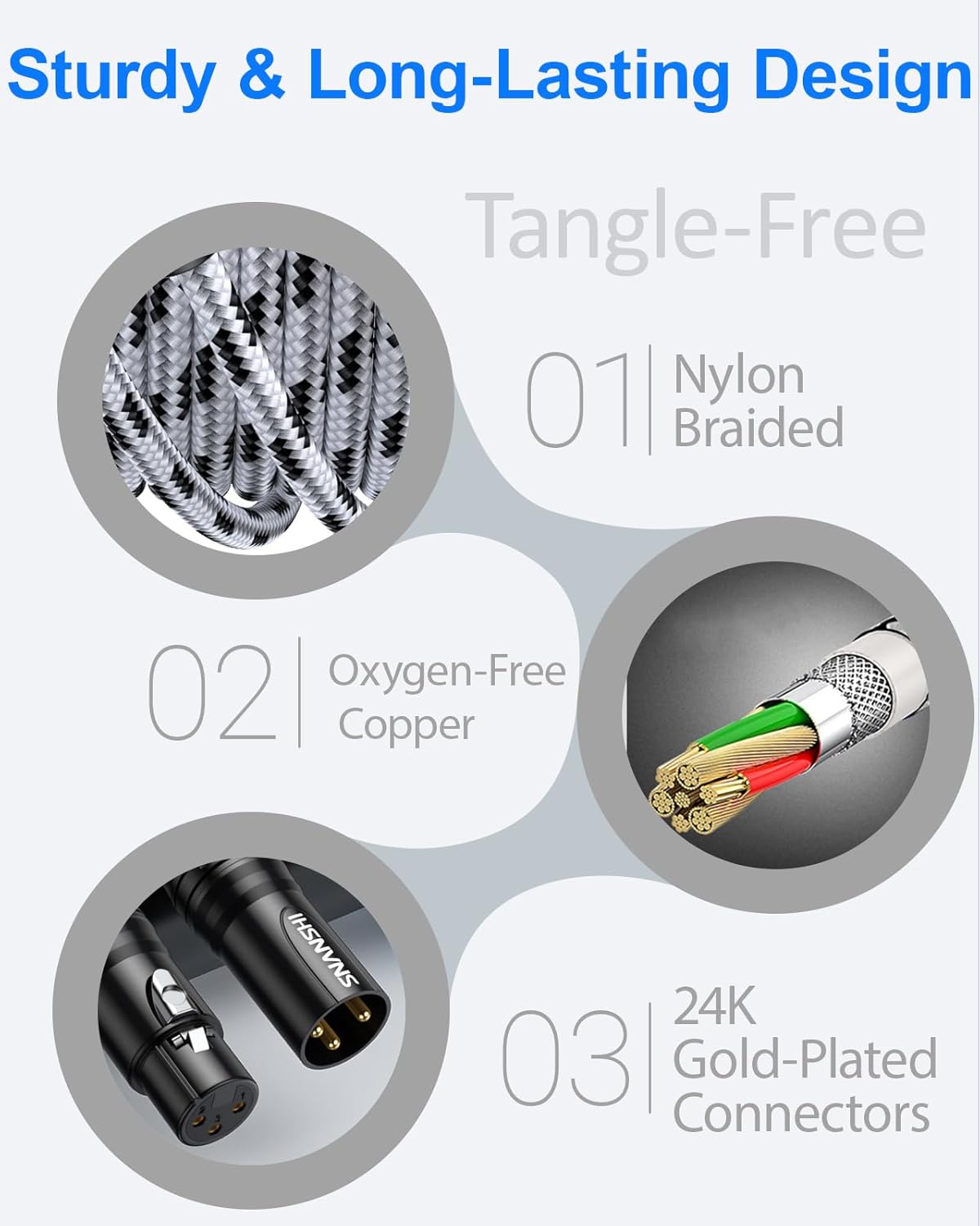 Built with Premium Materials: Our xlr cable male to female features oxygen-free copper for clear signal transmission, multiple layers of shielding to block interference, and durable gold-plated connectors for reliable, corrosion-resistant connections