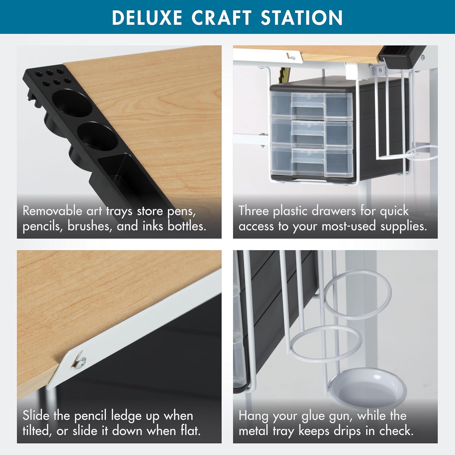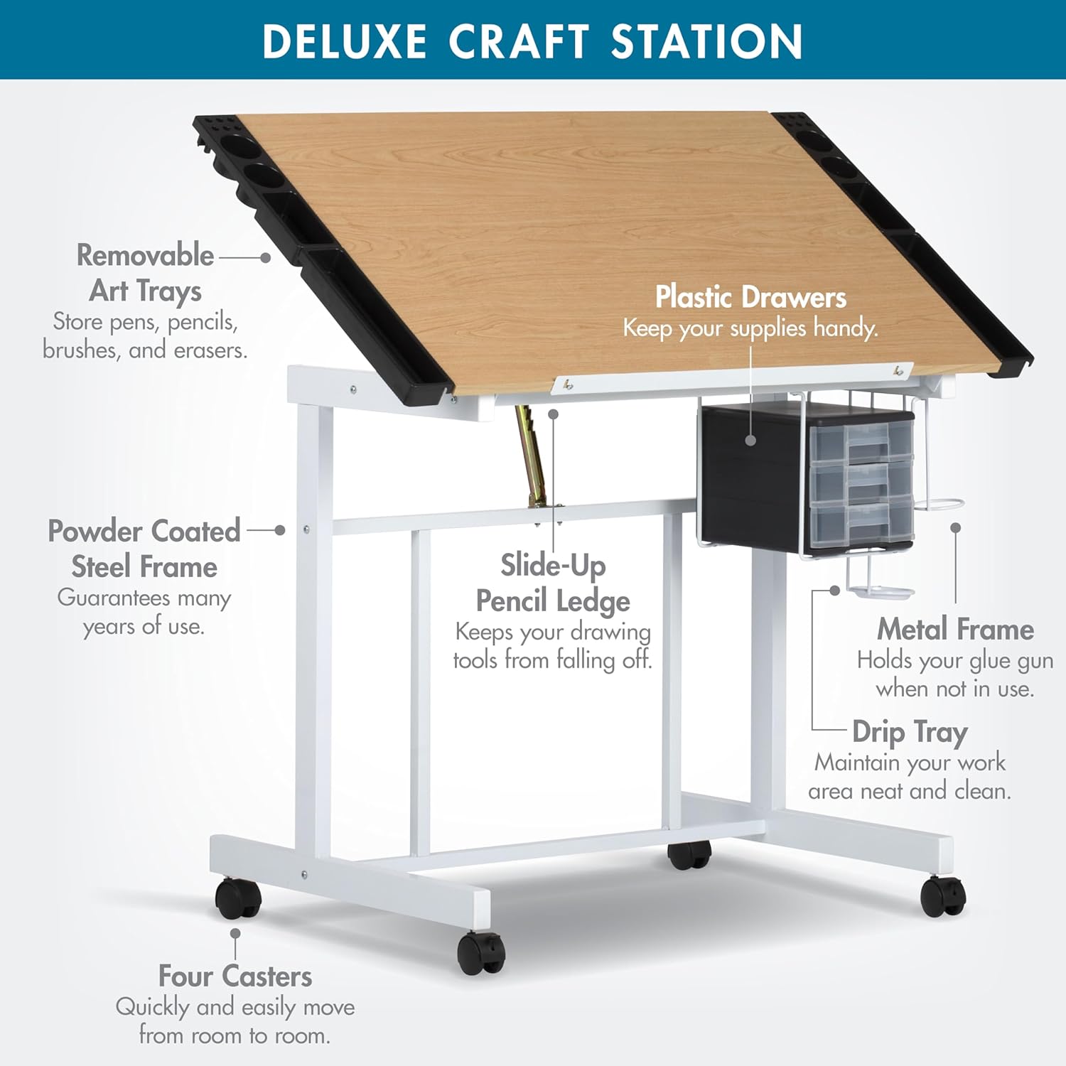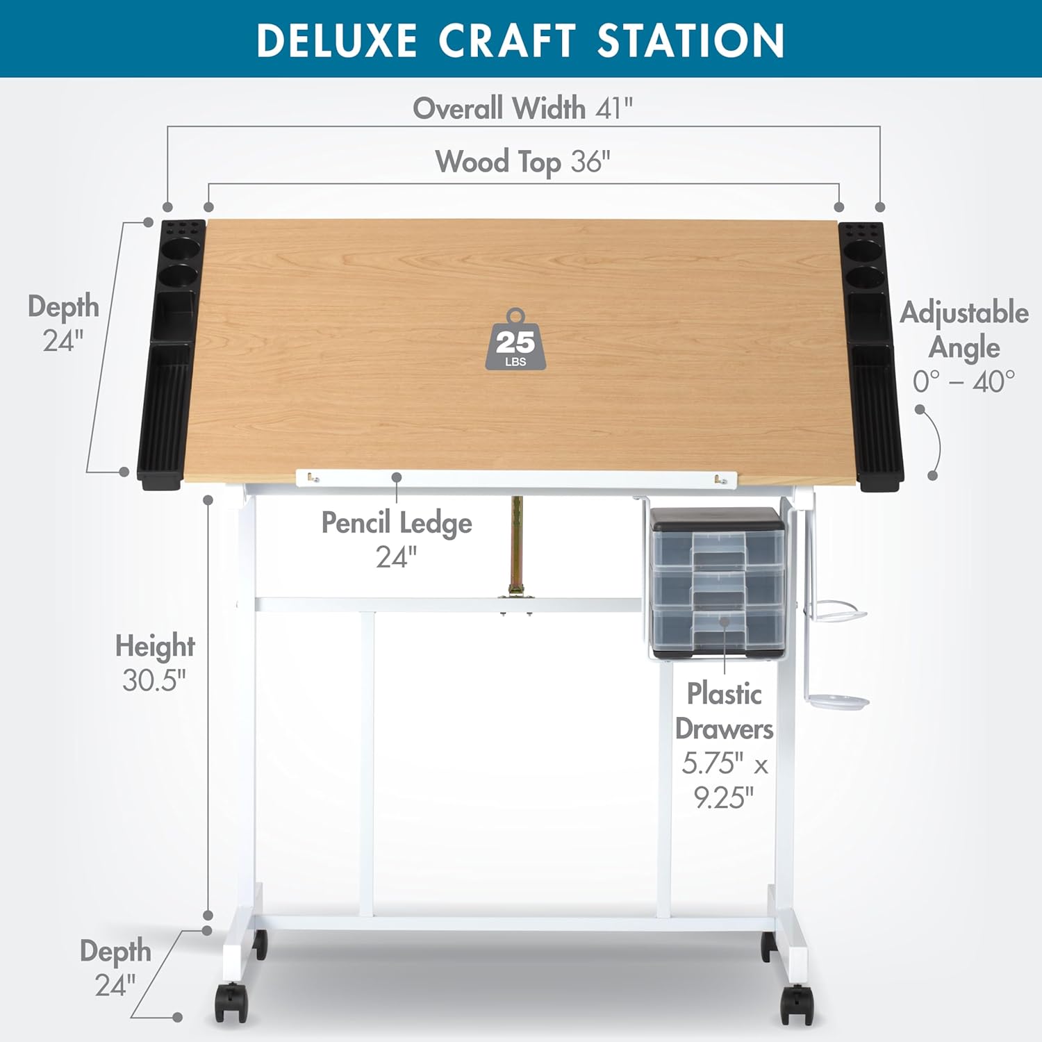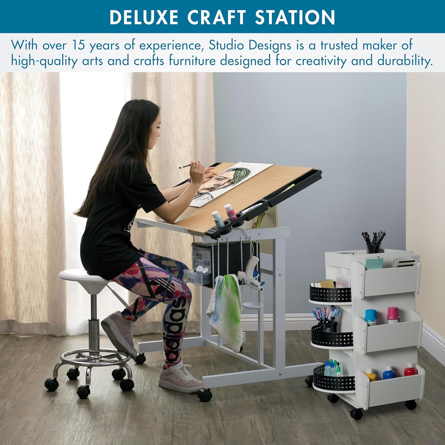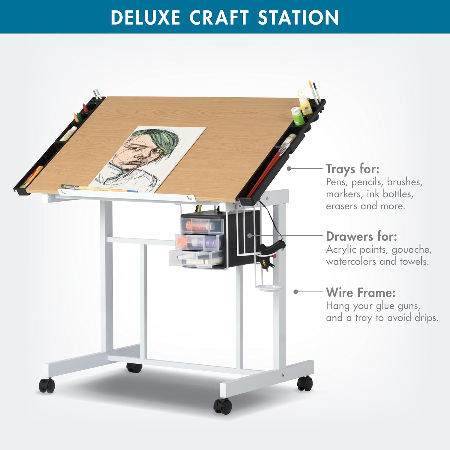 Studio Designs Deluxe Craft Station, Top Adjustable Drafting Table Craft Table Drawing Desk Hobby Table Writing Desk Studio Desk with Drawers, 36”W x 24”D, White/Maple