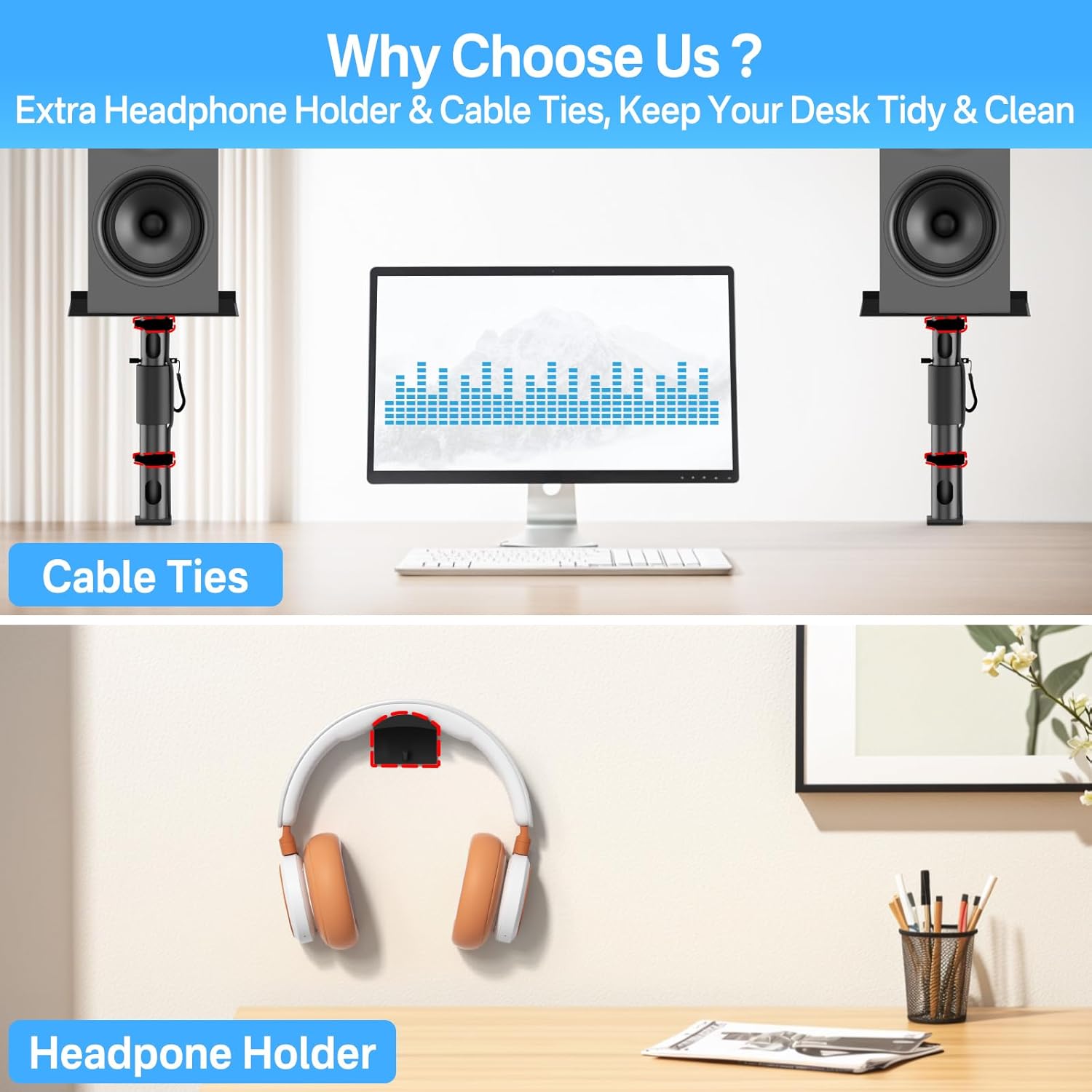 Studio Monitor Stands for PreSonus, JBL Nano K and More Monitor Speaker Stands, Adjustable Height & Tilt & Swivel Desk Bookshelf Speaker Stands for KRK, Klipsch, Polk and More Wr Headphone Holder