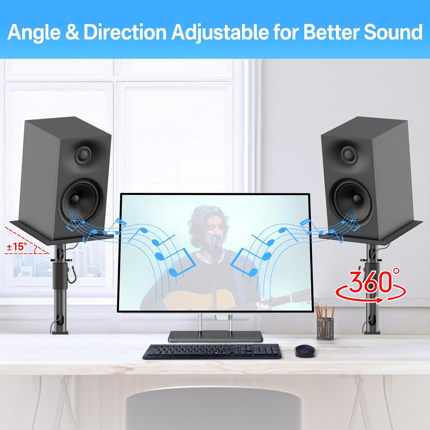 Angle Adjustment- The speaker desk stands platform can be adjusted 15° forward and backward for better sound reception. This feature allows you to fine-tune the positioning of your speakers for optimal audio performance and clarity. Adjust the knob, the pole can be rotated 360° to provide the best orientation, allowing to place the sound towards your ears.