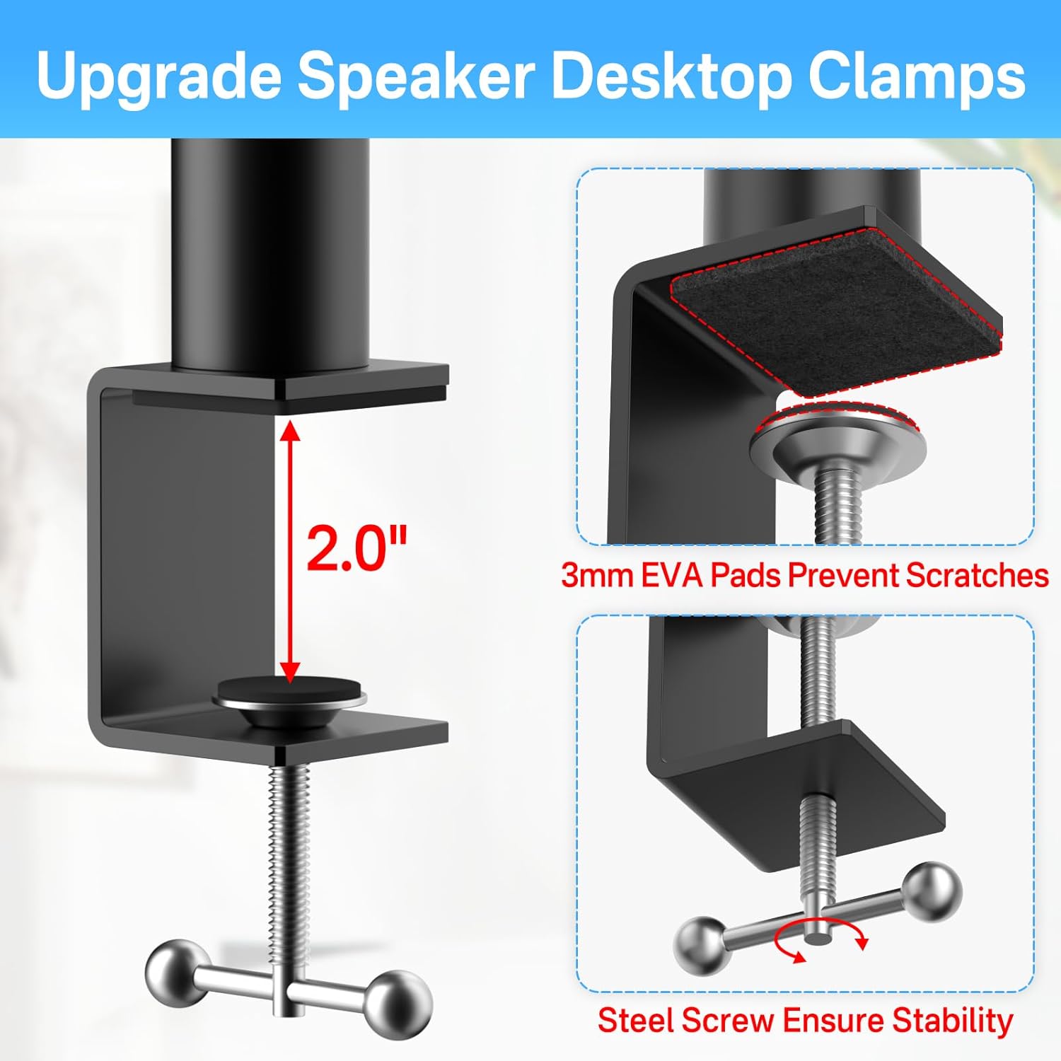 Safety Design – Made of high-quality metal material, the desk speaker mount can bear 40lbs and hold your equipment securely for your use. The desktop clamp is upgraded with an anti-slip and anti-scratch EVA pads design, which not only ensures that the desk speaker stand is firmly in place and protects the safety of your devices, but also protects your desktop from scratches. You can trust these speaker stands to provide reliable support and durability for your audio setup.