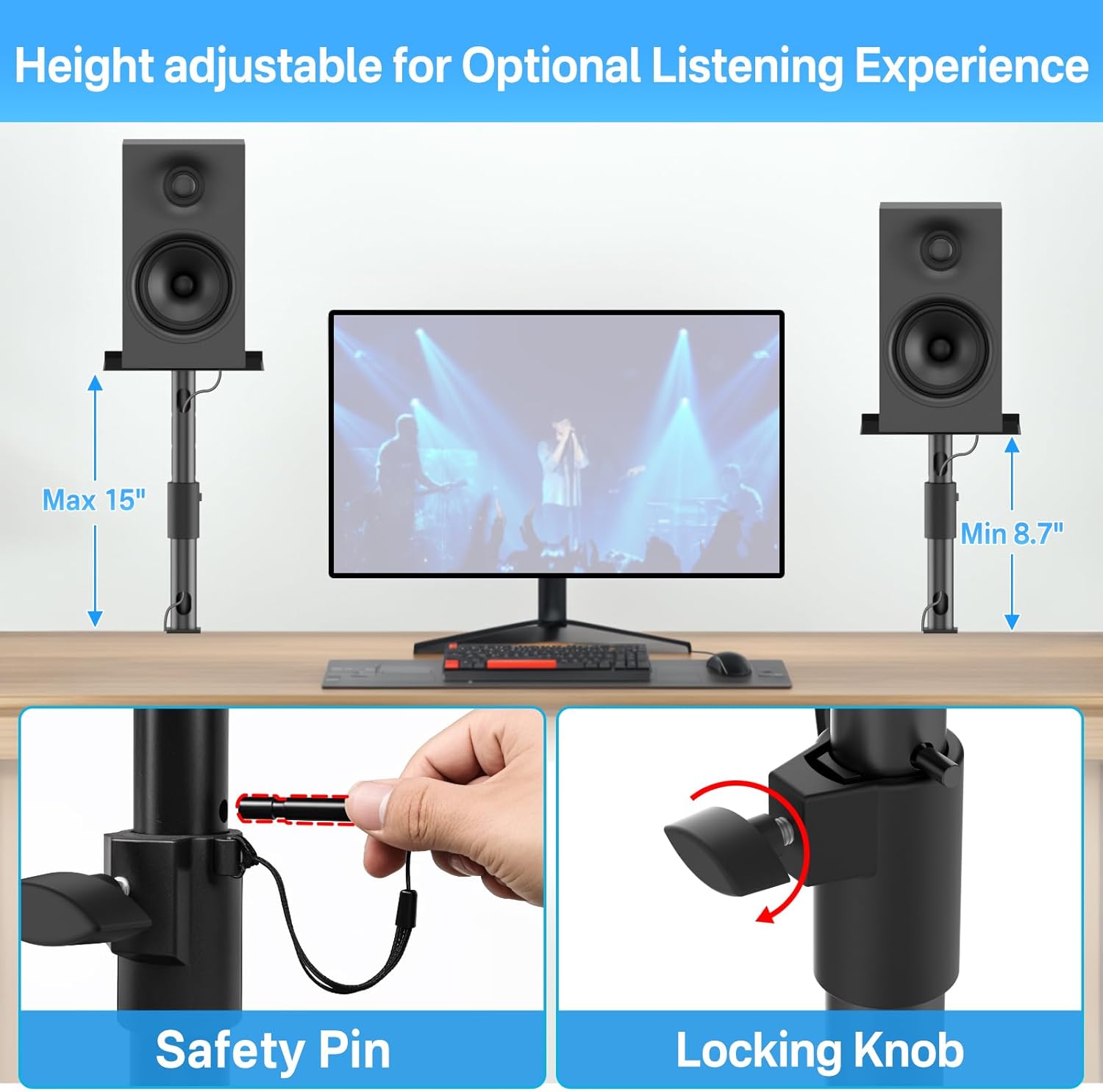 Adjustable Height – The height adjustment range of the desk small speaker stands is 8.7″ to 15″ for a better listening experience. With safety pin providing double protection to fix the height positioning of your speakers, and prevent the stand from falling down and causing damage to the speaker. You can customize the height of the speaker monitor stands to suit your individual preferences and optimize the sound quality.